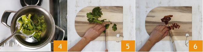 Once the broccoli is cooked, you can drain them 4. Place them on a cutting board and chop them into small pieces 5. Drain the sun-dried tomatoes from the oil and also cut them into small pieces 6.