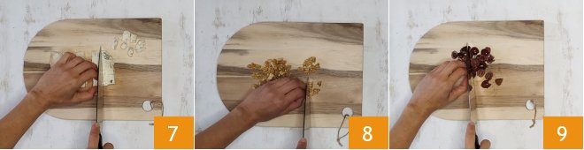 Cut the gorgonzola into cubes 7, coarsely chop the walnut kernels 8, and slice the pitted olives into rounds 9.