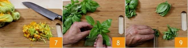 Then move on to the zucchini flowers: soak them in cold water to wash them, then let them dry on a cloth or paper towel. Remove the stem with a knife 4 and the pistils inside the zucchini flowers (5-6).