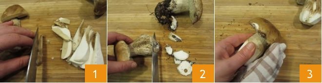 To prepare the barley with mushrooms and apples, make the Vegetable broth that you will need hot for cooking the barley. Then move on to the How to Clean Porcini Mushrooms: remove the base of the stem 1 clean the surface with a cloth to remove soil residues 2, then cut them into slices lengthwise 3. Set them aside and continue with the recipe.