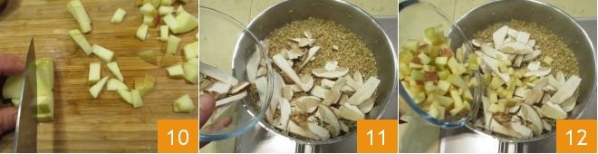 then without peeling, cut them into small cubes 10. Halfway through cooking the barley (after about 10 minutes), add the porcini mushrooms 11 and the diced apples 12