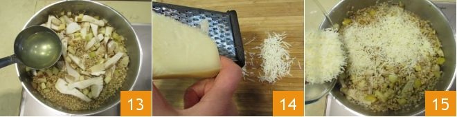 Continue cooking for another 10 minutes or so, always adding the broth little by little 13. Grate the semi-aged Pecorino cheese 14 and when the barley is cooked, turn off the heat and stir in the grated cheese 15.