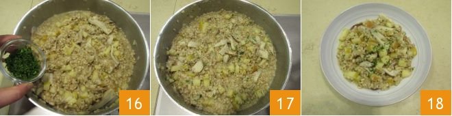 Finally, season with freshly chopped parsley 16, stir to flavor 17, and immediately serve the barley with mushrooms and apples hot 18!
