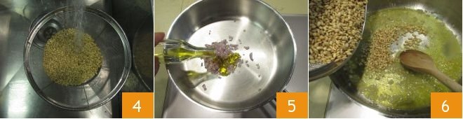 Rinse the barley under running water 4, then let it drain in a colander. Peel and chop the shallot, then pour a drizzle of oil into a pan, add the chopped shallot 5 and sauté over moderate heat until it becomes translucent. At this point, add the barley 6, toast for a minute,