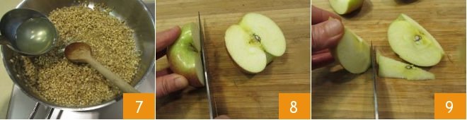 then add a ladle of broth 7, salt, pepper, and continue cooking for about 20 minutes as you would for a risotto, adding the broth little by little as needed, stirring occasionally. While the barley is cooking, take care of the apples: wash and dry them, then cut them in half 8 and then into 4 wedges. Remove the central core from the wedges 9,