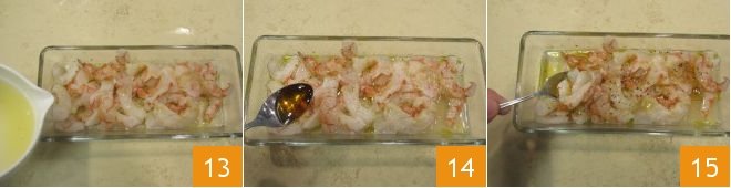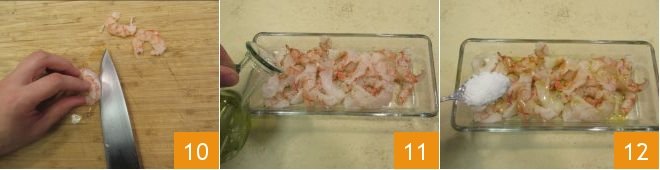 Meanwhile, cut the shrimp in half lengthwise 10; if your shrimps are not already cleaned, you can follow our cooking school: how to clean shrimp. Gradually place them in a bowl and season them with oil 11 and the salt flakes 12.