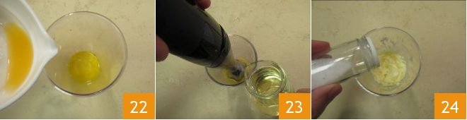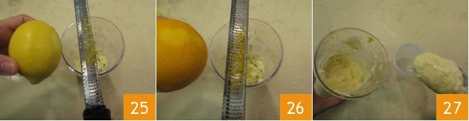 Then add the lemon zest 25 and orange zest 26. Mix everything and place in a kitchen squeeze bottle 27.