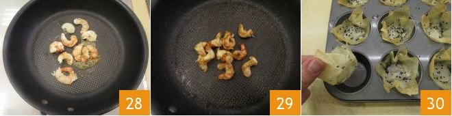 At this point, drain the shrimp from the marinade and place them in a very hot pan 28. Cook them for a few minutes until they are golden brown 29, then set them aside. Gently unmold the baskets 30 and place them on a tray.