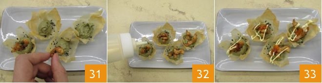 Now assemble them, filling them with a bit of avocado cream, two pieces of shrimp 31, and cover with a bit of citrus mayonnaise 32. Finish by sprinkling some salmon roe and serve the baskets with shrimp and avocado 33.