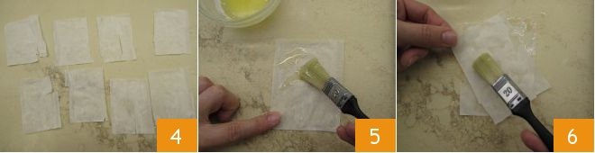 In this way, you will obtain 8 equal rectangles 4; for each basket, you will need to use 2 rectangles. Then brush the entire surface of one of the rectangles with the melted butter 5 and place another rectangle on top, ensuring the sides do not align, but the points are slightly offset, forming a sort of star. Brush again with the butter 6.