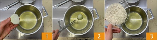 To prepare basmati rice with salmon, sesame, and spicy sauce, first, heat the water you will use to cook the rice. Heat the olive oil in a large pot, add half an onion 1 and a crushed garlic clove 2 and let it infuse. Remove the garlic and onion and pour in the basmati rice 3.