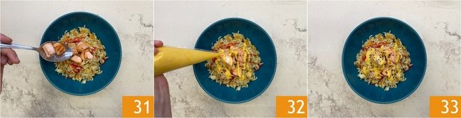 Add the pan-fried salmon cubes 31, season with the homemade mayonnaise, and finish with black sesame seeds 33. Your basmati rice with salmon, sesame, and spicy sauce is ready to be served!