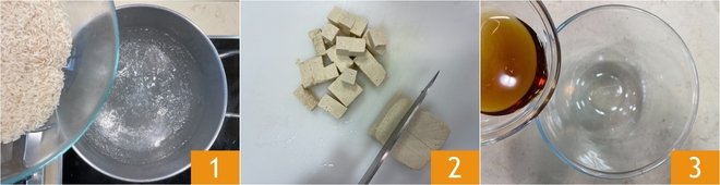 To prepare basmati rice with soy-marinated tofu and stir-fried vegetables, first put the rice into plenty of salted water 1 and cook for the time indicated on the package. Meanwhile, take care of the other ingredients: cut the tofu into cubes, then pour the maple syrup into a bowl 3.