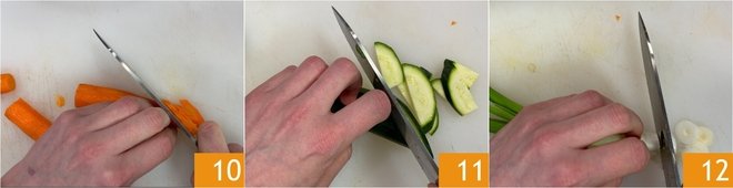 Peel and trim the carrots, halve them lengthwise and cut them into diamond-shaped slices about 1/8–5/32 inch thick (approximately 3–4 mm) 10. Do the same with the zucchinis 11. Finally, slice the spring onion 12.