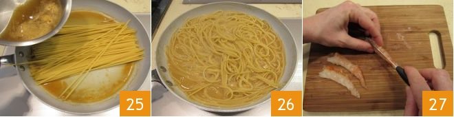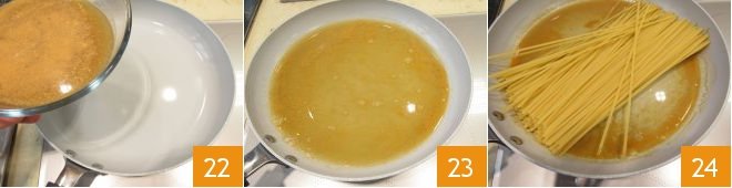 Meanwhile, heat a part of the bisque in a large pan (22-23), add the bavette 24 (they should lie comfortably and you should be able to stir them easily).