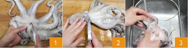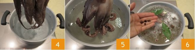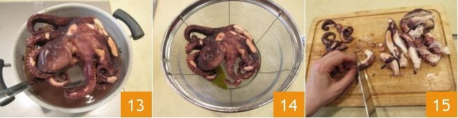 Once cooked, let the octopus cool inside its cooking water, then drain it (13-14) and cut it into pieces 15.