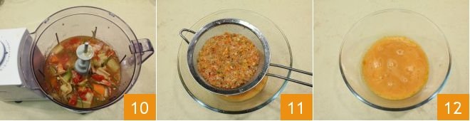 Let it cook on low heat until the liquid is reduced by half, then blend everything 10 and strain it with a fine mesh strainer 11. You have obtained your shellfish fumet 12.