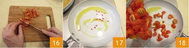 Then also cut the cherry tomatoes into 4 16. In a pan, brown the garlic and the chili pepper, seeds removed and cut into strips, with the extra virgin olive oil 17, then add the cherry tomatoes and salt 18;