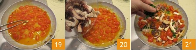 let it cook for about 10 minutes, then turn off the heat, remove the garlic 19, add the octopus 20 and finely chopped parsley 21.