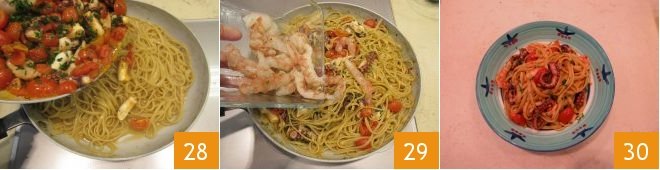 Once your bavette are almost cooked, add the cherry tomato and octopus sauce 28, the shrimp 29 (if they are smaller, you can leave them whole), chopped parsley, and ground pepper. Finish cooking and serve your bavette with octopus and shrimp while still hot 30.