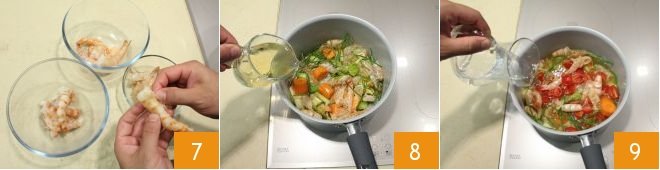 Cover to the brim with the boiling fumet 25. Stir continuously to prevent them from sticking, gradually add the hot fumet until they are 3 minutes from being cooked 26 (if you run out of fumet before the pasta is done cooking, you can use hot water or light vegetable broth). Meanwhile, cut the shrimp in half lengthwise 27 (if they are smaller, you can leave them whole).
