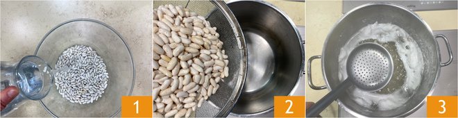 To prepare beans all'uccelletto, you will need to soak the dried cannellini beans in a large bowl covered well with cold water 1, for an entire night. The next day, drain the beans and rinse under running water. Pour them into a large pot with about 2.5 quarts of cold water 2. Cook the cannellini beans on high heat until they come to a boil, then lower and simmer on low heat for at least 50-60 minutes, skimming occasionally with a skimmer 3.