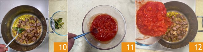 Stir and let it flavor. When the sausage is well-browned, you can remove the aromatics 10. Then tear the peeled tomatoes into pieces in a bowl 11, before adding them to the pot 12.