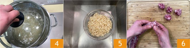 You should cook with the lid on the whole time 4. Once ready, when they are cooked but not mushy, drain and save the cooking liquid 5. Remove the casing from the sausage, then crumble it by hand 6.