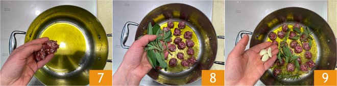 In the pot where the beans were boiled, heat the oil, add the sausage 7 and let it sizzle on low heat. Add the aromatics: sage 8 and peeled and whole garlic (or in its skin, if you prefer a milder taste) 9.