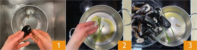 To prepare white bean and mussel soup, start with the How to Clean and Open Mussels: remove the byssus and rinse them under running water, scraping the shell with a steel wool pad 1. In a saucepan heat half of the oil with the parsley stems and the peeled garlic 2. When the base is hot, add the mussels 3.