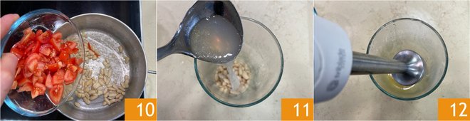 Add the chopped tomatoes to the pan 10 and cook for 2-3 minutes over low heat. Meanwhile pour about 2 cups (approximately 17.6 fl oz) of the mussel cooking liquid into the blender jar 11 and blend 12 to obtain a cream.