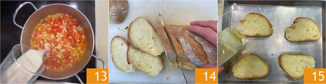 Add the bean cream to the pan and continue cooking for about 20 minutes, so that the liquid reduces slightly 13. Meanwhile, slice the bread 14 and season with oil and salt 15.