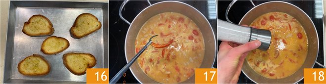 Toast the slices of bread in the oven at 392°F for 6-7 minutes 16. Once the soup has finished cooking, remove the garlic and chili 17, then adjust the salt 18.