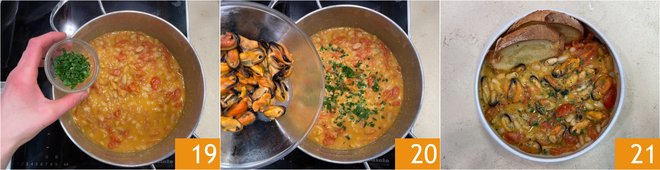 Turn off the heat and garnish with chopped parsley 19. Finally add the shelled mussels 20 and mix well. Serve your bean and mussel soup accompanied by the bread croutons 21!