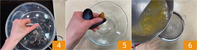 Cover them immediately and wait a few minutes for them to open 4. When they are all open, remove the mussels from their shells 5 and strain the cooking liquid 6. Set aside. Quarter the tomatoes.