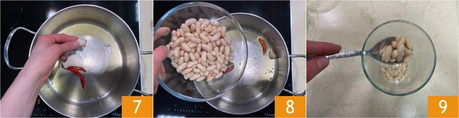 In a pot heat the other half of the oil with the chili pepper cut in half and the garlic 7, add the beans, salt and let them absorb the flavors over low heat for about 6-7 minutes 8. Remove half of the beans and transfer them to the blender jar 9.