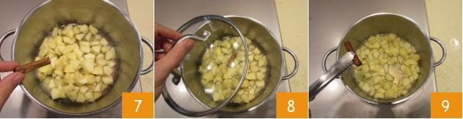 Bring everything to a boil, then add the cinnamon stick 7, cover with a lid 8, and let it cook for 10 minutes. At this point, remove the cinnamon stick 9