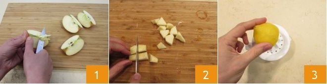 To prepare the beef medallions with apple sauce, start with the latter. Wash the apples, cut them into wedges, and peel them, removing the core 1. Dice them 2, set aside, and squeeze the lemon 3.