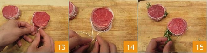 Once the apple sauce is made, take care of the beef fillets. Wrap them with bacon 13 and tie them with string 14; then insert rosemary sprigs, wedging them between the string and the meat 15.