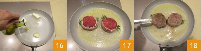 Pour the oil and butter into a pan 16 and let them melt over very low heat. Add the freshly prepared medallions 17, salt, pepper, wait 3-4 minutes until they are well seared, then turn the fillets 18.