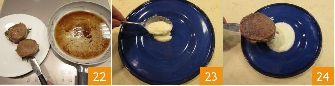 Transfer the medallions to a plate 22 and remove the rosemary sprigs and strings. At this point, take the apple sauce again: with the help of a spoon 23, create a base on the bottom of the plate, where you will place your medallions 24. Now all that remains is to serve your beef medallions with apple sauce!