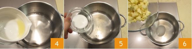 Pour the water into a pan, add the lemon juice 4, the sugar 5, and the apple cubes 6.