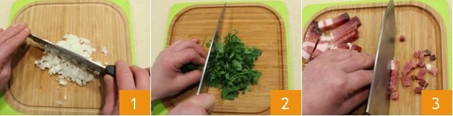 To prepare beer and speck risotto, start by peeling the white onion, then finely chop it 1 and set it aside. Wash the parsley and finely chop it with a knife 2. Now take the slice of speck and cut it into very small cubes 3.