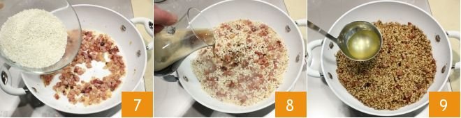 Add the rice 7 and toast it until it becomes translucent, then add the dark beer a little at a time 8, until it's used up, letting it absorb each time before adding more. Once the beer has been absorbed, pour in a ladle of broth 9 and continue until cooking is complete, taking care to add a little broth as needed to prevent the rice from drying out too much.