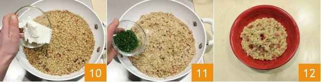 When the rice is al dente, add the ricotta 10, stir to melt it, it should make the rice creamy. Once cooked, turn off the heat, add flavor with the chopped parsley 11, and serve your beer and speck risotto hot!