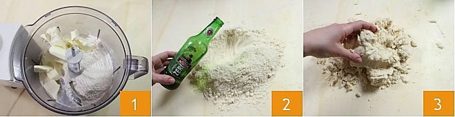 To prepare the beer glasses with parmesan cream, start by making the beer shortcrust pastry: put the flour and butter in a mixer 1 and blend until you get a sandy mixture. Pour the mixture onto a pastry board (or into a bowl), create a well in the center and pour the beer in a stream 2. Knead so that the flour absorbs all the beer and forms a nice homogeneous dough 3.