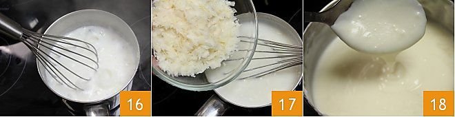 Cook the mixture over low heat, continuing to stir until it thickens 16; it will take about 8 minutes. Remove the saucepan from the heat and gradually add the grated Parmigiano Reggiano 17. Mix the parmesan well into the béchamel: the consistency of the cream should be such that, if lifted with a spoon, it remains on the surface for a while before sinking 18.