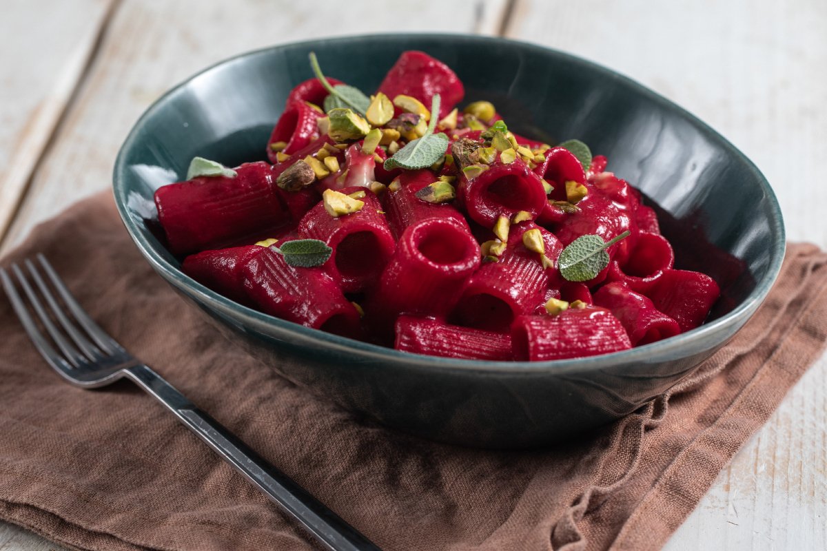 Mix briefly 19, so as not to completely melt the cheese. Plate with chopped pistachios and sage leaves 20. Serve the beetroot and gorgonzola pasta immediately 21.