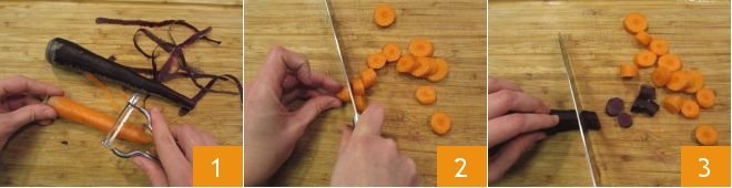 To prepare the beetroot and lentil stew, first, prepare all the ingredients: wash and peel the orange and purple carrots 1, then cut both into slices about 0.4 inches thick (2-3).