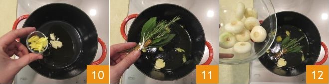 Now take a cast iron pot with a lid suitable for slow cooking, heat the oil and add the crushed garlic and ginger 10. Let them sizzle for a couple of minutes over high heat, then add the herb bundle 11, and shortly after, add the onions 12,